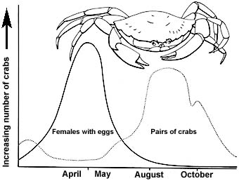Many anglers, throughout the country, regard crab as the premier bait for a wide variety of the more popular fish species. Green shore crabs are usually the easiest to obtain and enormous numbers of these can be collected in a short time from harbours, estuaries and rocky shores. The ordinary hard-crab is useful as ground bait and makes a first class hook bait for large wrasse but, despite much speculation to the contrary, no one has ever presented evidence of catches to show that they are a good general bait. Usually crabs of all types are collected and used as bait when they are about to moult (peelers) or have just moulted (soft-backs). Crabs grow and moult most frequently when they are young and in warm weather. A convenient way of recognising both peeler and soft-back crabs is to look for pairs. The males can infallibly detect females which are about to shed their shells and carry them about until they moult, at which time mating occurs. On the West Coast this mostly is in August and September. The females do not produce their eggs until the following April-May, though in our part of the country they are also found in winter. Other than pairs, peeler and soft-crabs of the three common species can be found at almost any time of year, but will be most frequent in the warmer months.