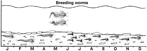 Lugworms also migrate by a form of swimming, which takes place at times not associated with spawning. Swimming worms have been seen in May, when bare stretches of beach may be quickly re-colonised. It seems probable that fish are especially attracted to lugworm beds, both below and between the tidemarks, in May and in October-November. At these times they may even be conditioned to, or preoccupied with, feeding on these worms.