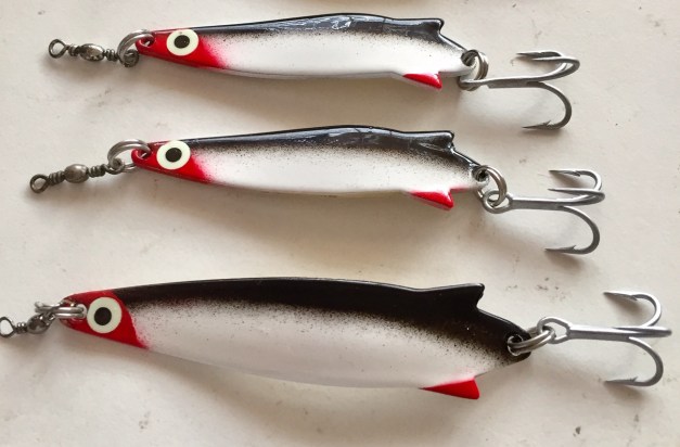 • I attached single hooks with skirts to a couple of lures to provide some variation. These also worked well but the hook up rate tended to drop off so mostly I used treble hooks with flattened barbs.